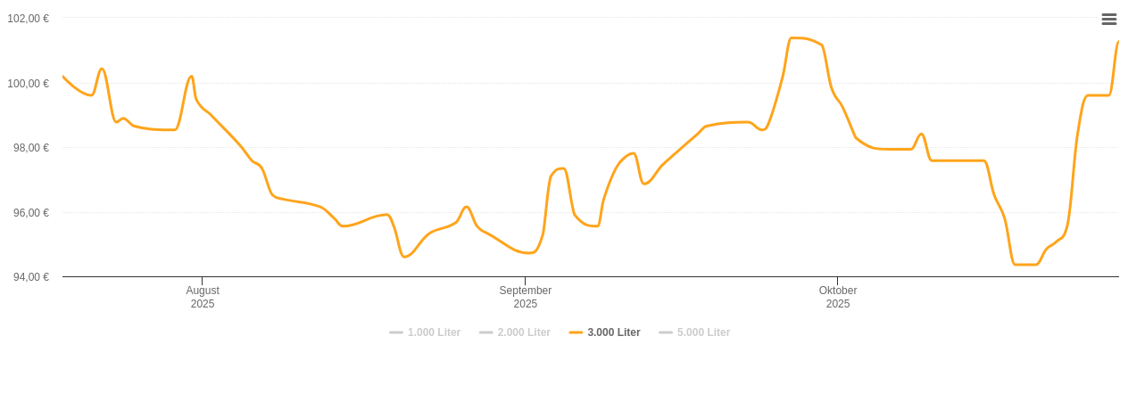 Preise für Heizöl in Standardqualität nach DIN 51603-1 in € / 100 Liter inkl. MwSt. und Lieferung bei Abnahme von 3.000 Litern und einer Lieferstelle.