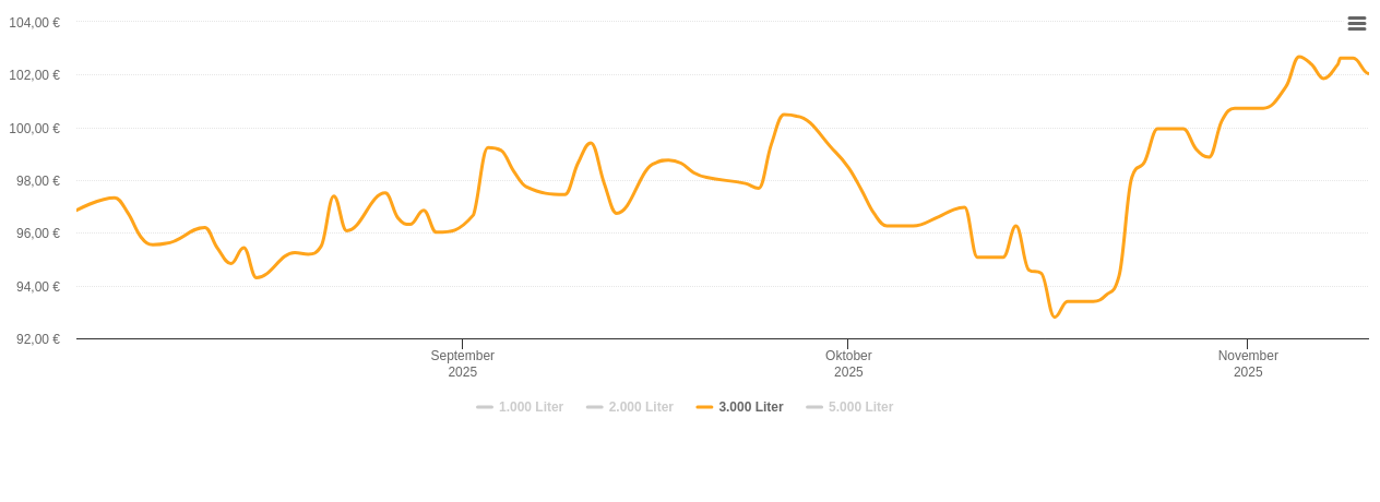 Preise für Heizöl in Standardqualität nach DIN 51603-1 in € / 100 Liter inkl. MwSt. und Lieferung bei Abnahme von 3.000 Litern und einer Lieferstelle.